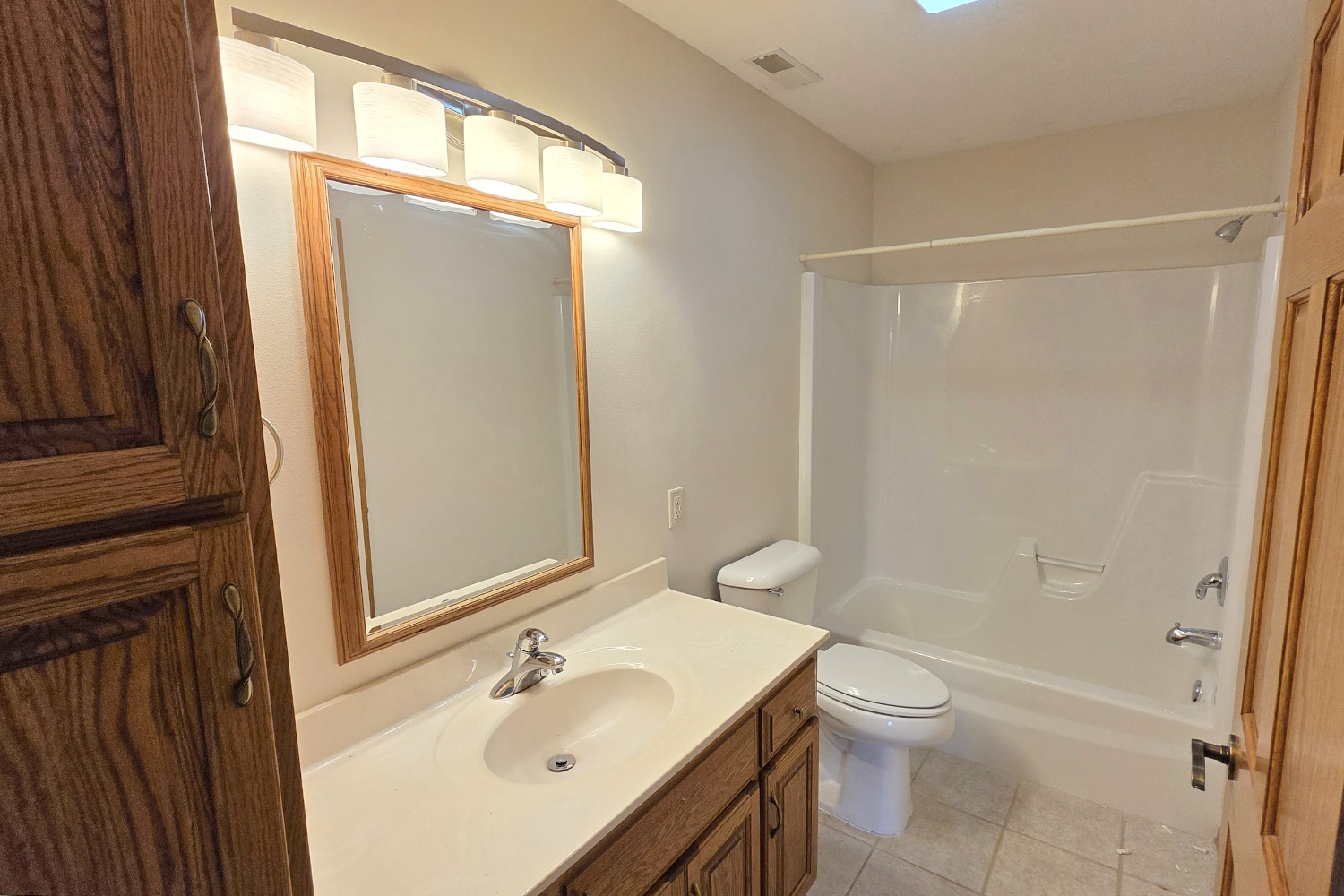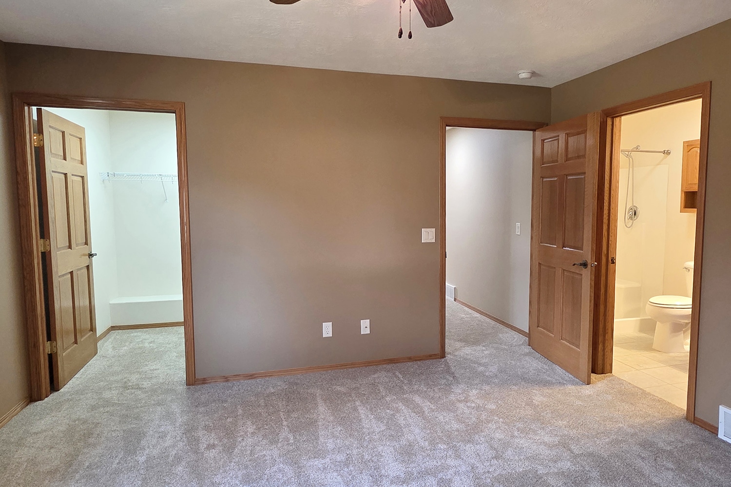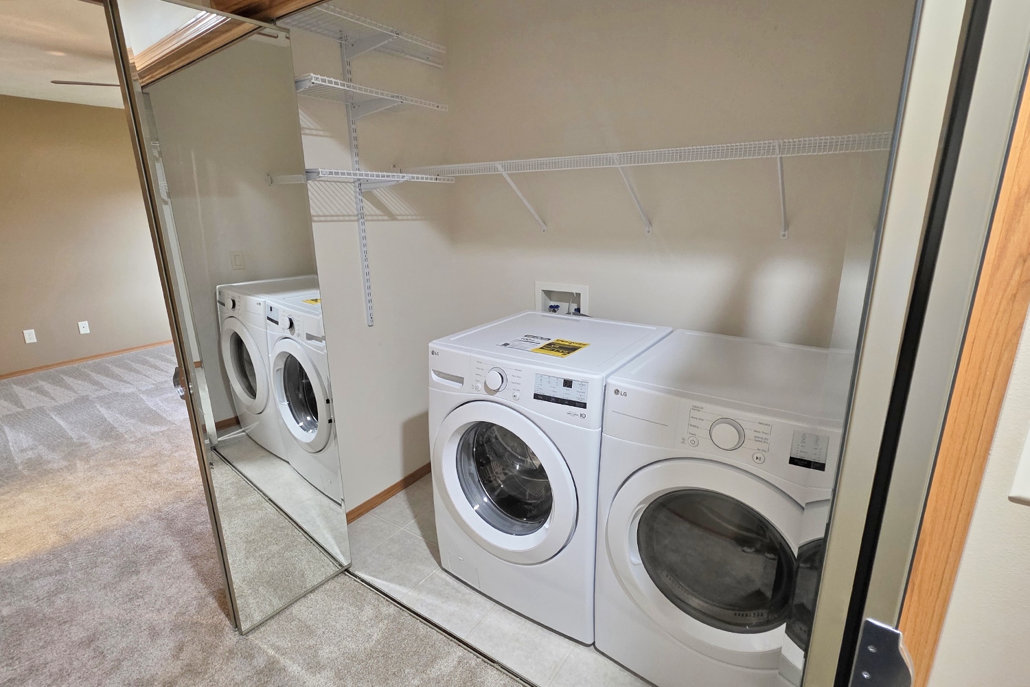 The home features a kitchen with dishwasher and microwave, central air, and convenient in home laundry. The primary suite includes a private bathroom with shower and a walk in closet, while the additional bedrooms offer large closets for extra storage.