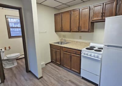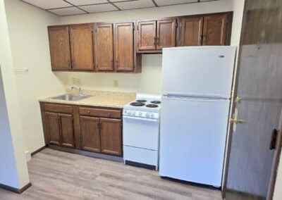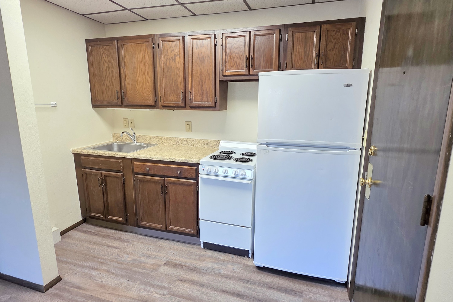 Centrally located studio / 1 bath apartment. This unit includes fridge, stove/oven, and coin operated laundry in the complex. Lawn care and snow removal provided.